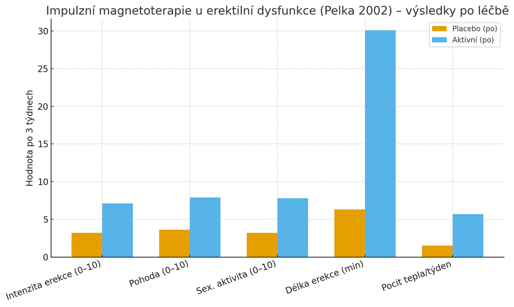 Pelka RB, Jaenicke C, Gruenwald J. Impulse magnetic-field therapy for erectile dysfunction: A double-blind, placebo-controlled study. Advances in Therapy. 2002;19(1):53–60. DOI: https://doi.org/10.1007/BF02850018. Alternativně viz záznam na https://pubmed.ncbi.nlm.nih.gov/12008861/.