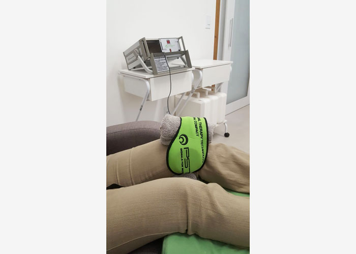 Pacient podstupujúci pulznú signálnu terapiu (PST) zameranú na patellofemorálny kĺb.