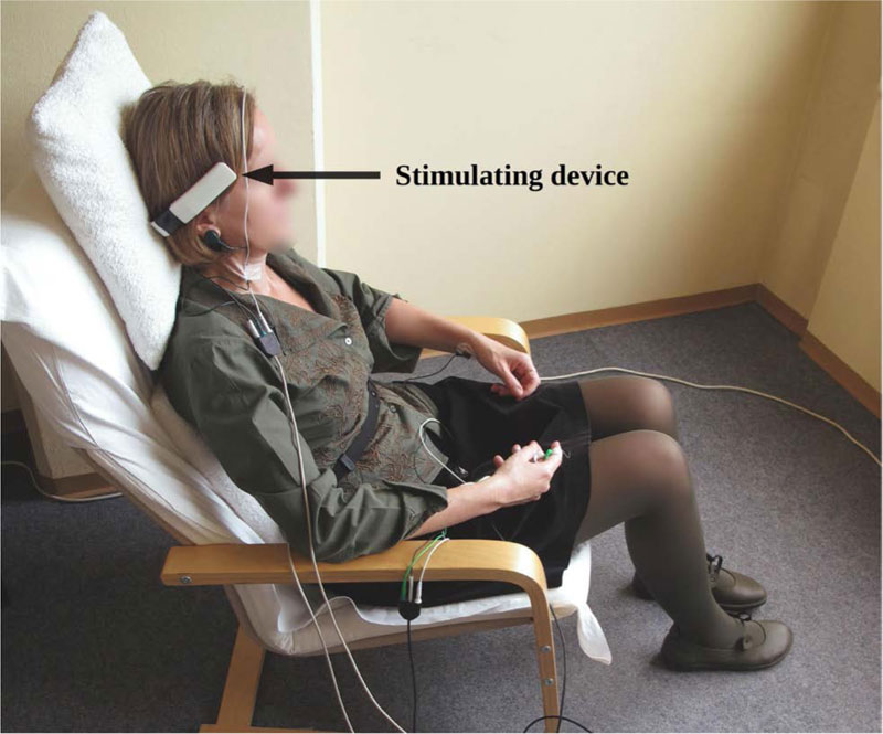 Ukážka reálneho priebehu merania: dobrovoľník sedí v pokojnej pozícii, na hlave má stimulátor s piatimi malými cievkami (tyl a spánkové oblasti) a snímacie elektródy na sledovanie mozgových vĺn a ďalších fyziologických parametrov. Zdroj: Jerman et al., 2019 (CC BY 4.0).